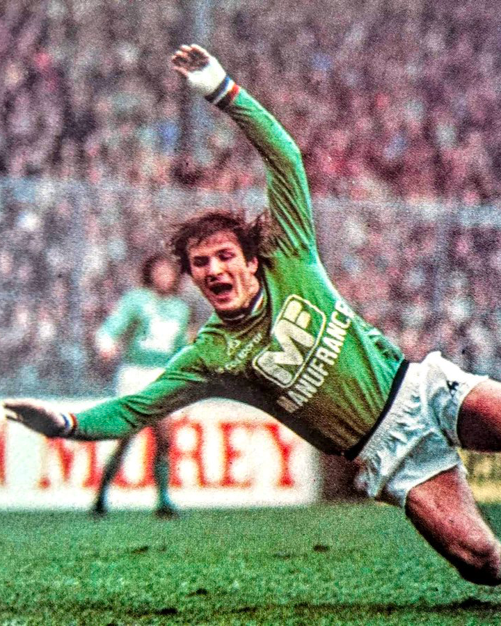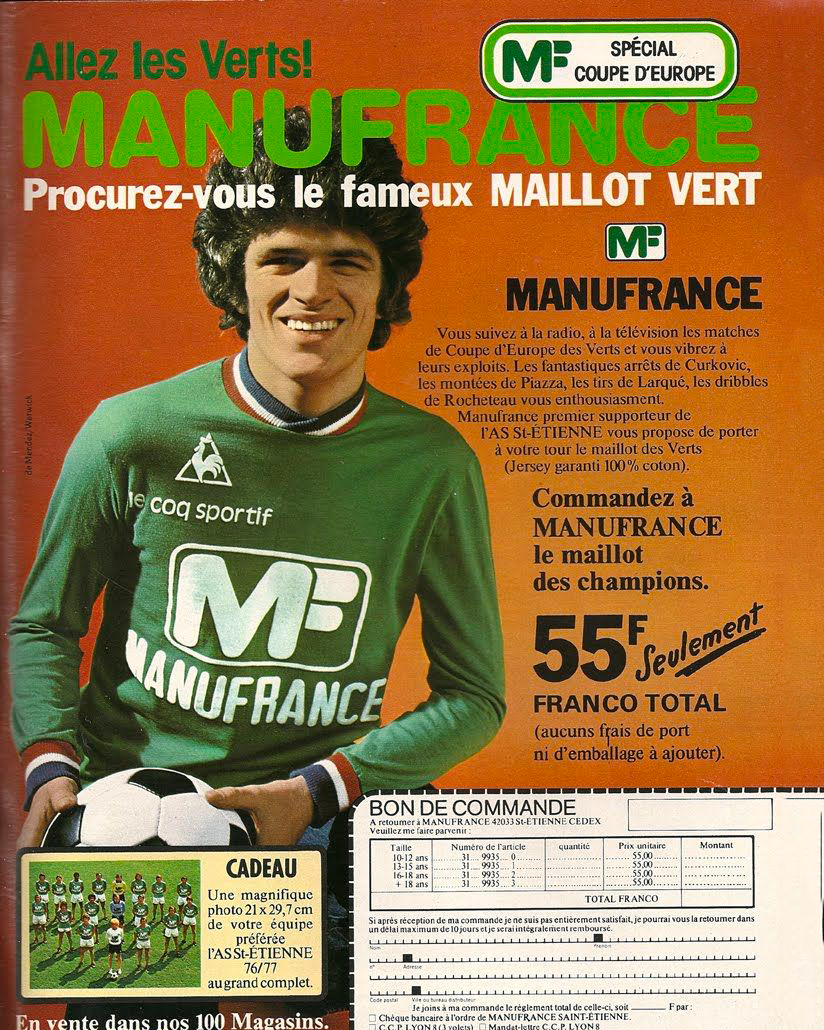 Quando si scrive di calcio francese, difficilmente nessun kit riesce a superare in fatto di iconicità quello marchiato Le Coq Sportif adottato dal Saint Etienne dal 1974 al 1978. A riprova che l'eleganza senza tempo di una divisa da gioco spesso si cela nella semplicità, la tradizionale palette verde smeraldo del club viene ravvivata dal sottile quanto fondamentale dettaglio dei bordi tricolori del colletto e delle maniche che rispecchiano i colori della bandiera francese. La risonanza del kit nella cultura pop fu così forte che il gruppo britannico Saint Etienne addirittura decise di omaggiare la squadra transalpina adottandone il nome.