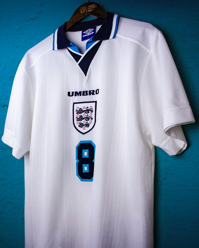 La lotta per la miglior maglia della storia della nazionale inglese è serratissima, ma tra le prime tre è quasi sempre presente quella prodotta da Umbro e utilizzata nell'europeo di casa dalla nazionale dei Tre Leoni. La squadra che tecnicamente appartiene ad Alan Sherear ma che idealmente ed emotivamente è di Gazza Gascoigne. Esteticamente il marchio inglese sceglie il celeste per completare i kit di una delle nazionali più deludenti della storia inglese - uscita in semifinale contro la Germania.