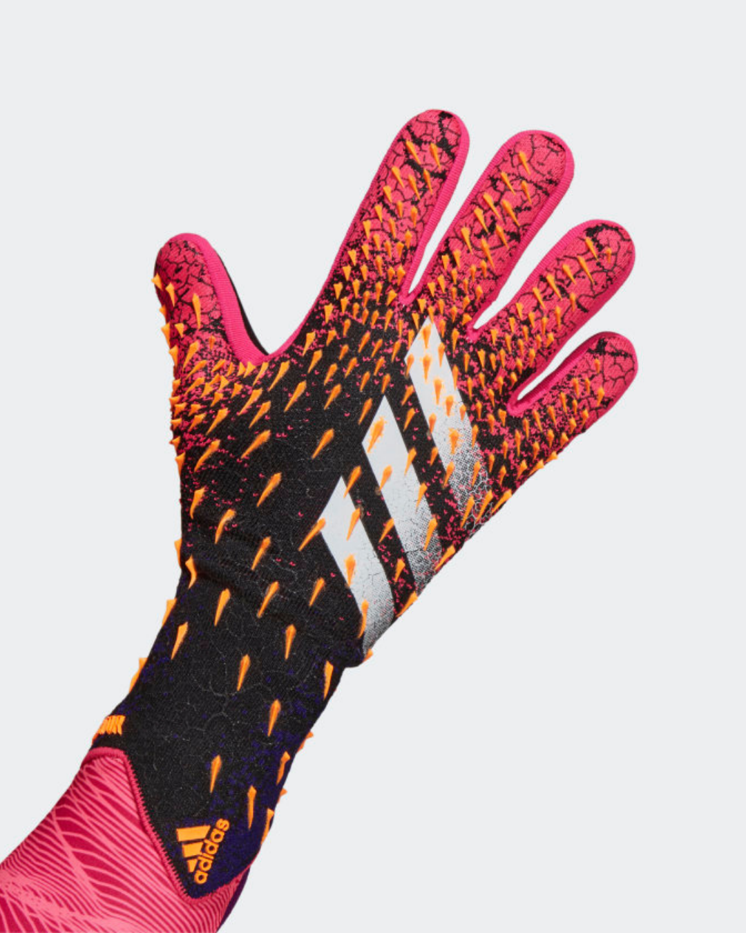 I guantoni Predator Pro Hybrid fanno parte della linea Predator e sono stati droppati a inizio 2020 nell'omonimo pack di scarpini. Sono realizzati con tessuto knit flessibile che insieme alla chiusura senza strappi che si adatta al braccio li fanno sembrare un prodotto di bioingegneria. Sul palmo della mano e sulle dita il materiale usato è una schiuma URG 2.0 garantisce il grip con il pallone anche quando la superficie è umida. Ma la vera caratteristica dei guantoni del portiere italiano sono le 288 spine distribuite sulle dita, su dorso e sul polso del portiere. Si tratta di mini scaglie di plastica ispirate appunto alla pelle di un rettile, da qui il nome demonskin, le stesse che si trovano sugli scarpini dell'ultima generazione di Predator. Secondo adidas, le scaglie - o spine - sono state distribuite sul guanto attraverso un sofisticato algoritmo in modo da configurare il contatto con il pallone. Non è chiaro in realtà in che modo le spine dovrebbero aiutare un portiere - mentre sugli scarpini ne influenza profondamente il contatto con il pallone - ma l'effetto estetico è sicuramente accattivante e forse anche quello placebo - in stile Space Jam - può aiutare dei giovani portiere a seguire l'esempio di Gigio Donnarumma.