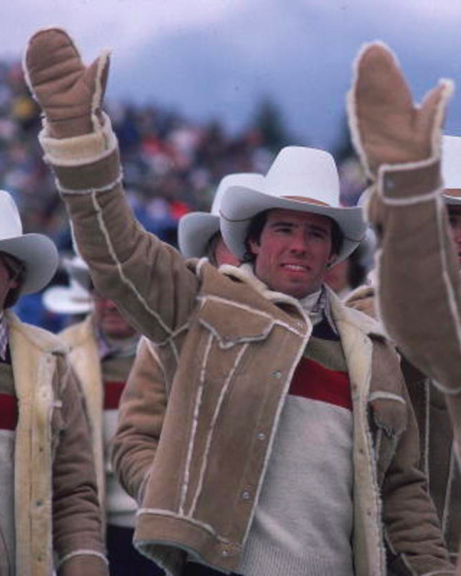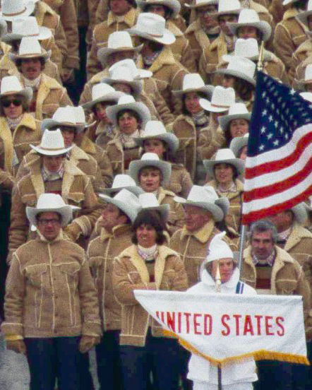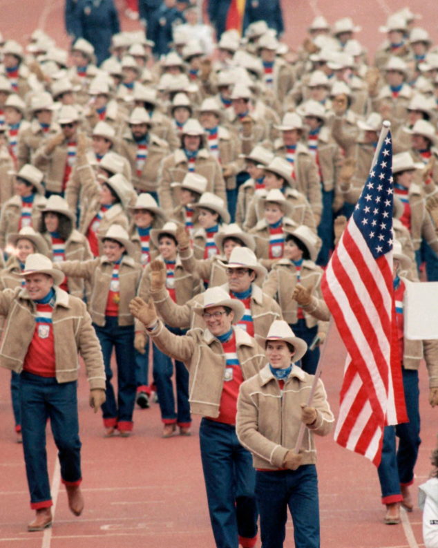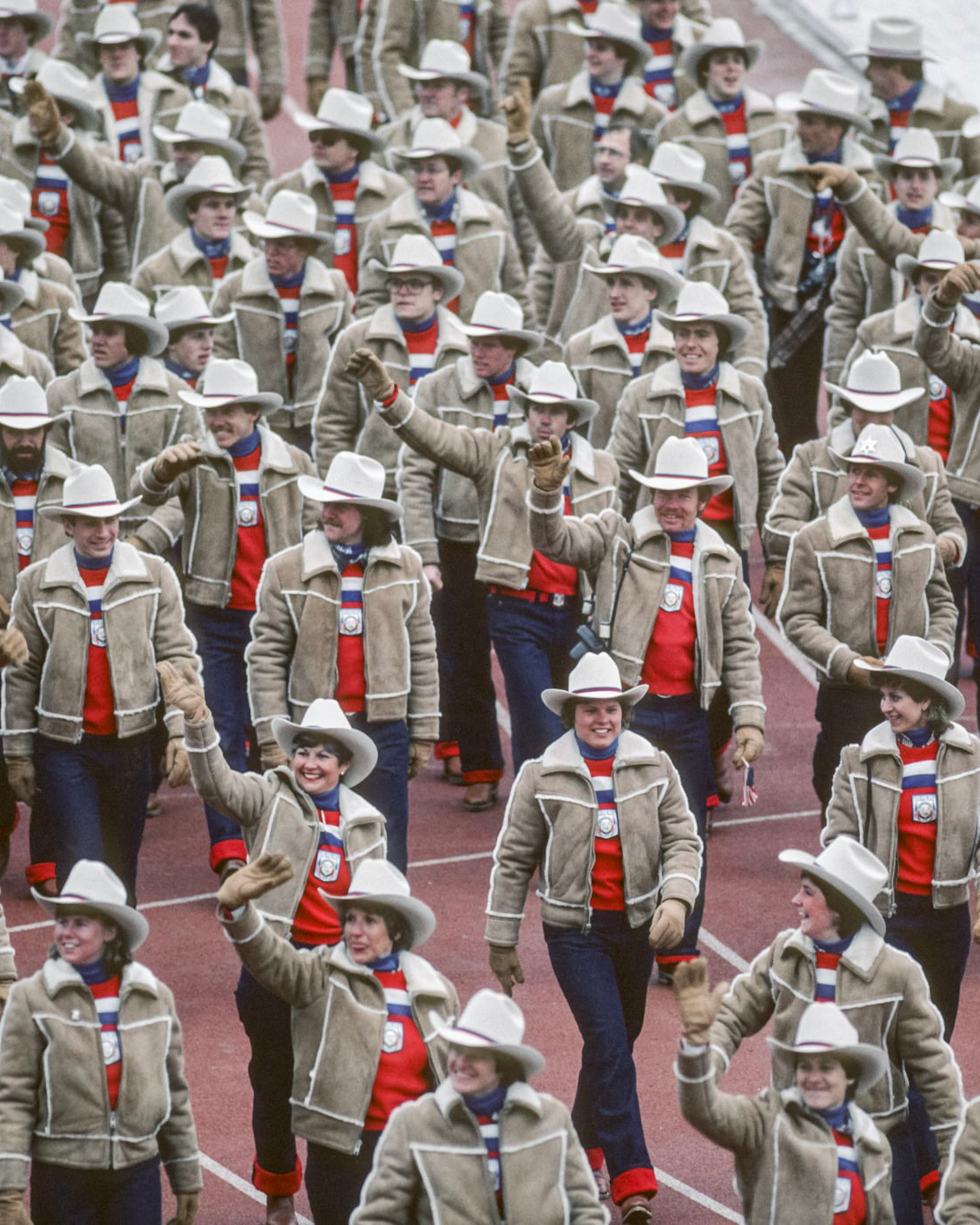 Deviazione invernale, per andare a Lake Placid, New York, dove nel 1980 il Paese ospitante sfilava e indossava divise disegnate e prodotte da Levis Struass. Anacronistica la scelta di avere il cappello da cowboy bianchi, simbolo americano ma soprattutto del Texas - mai noto per le sue temperature fredde. Oltre al copricapo, Levi's ha curato le giacche in shearling a strati, il dolcevita a righe e soprattutto i guanti foderati che garantiscono la protezione da un freddo che arriva anche a quindici gradi sotto lo zero. Tutta la follia e la stravaganza a stelle e strisce anche a 40 anni di distanza.