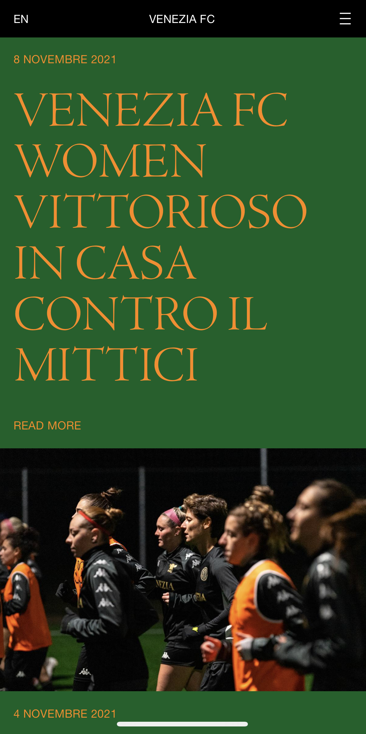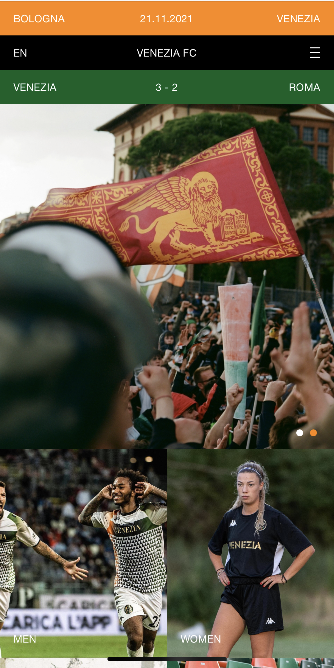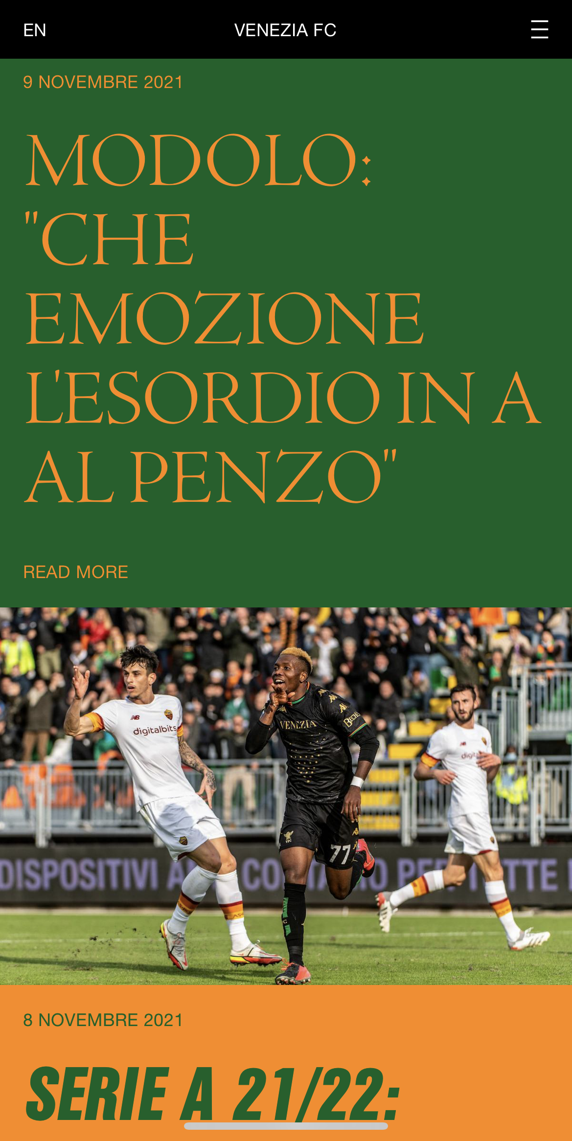 Ovviamente tra le squadre che hanno lavorato di più e meglio sul proprio branding non poteva mancare il Venezia, che le malelingue sostengono essere più una casa di moda piuttosto che una squadra di calcio, e che invece sta dimostrando come si possano fare bene entrambe le cose. Il sito è minimale, con grande spazio lasciato alle immagini della squadra e della città coerentemente con lo stile visuale usato nelle campagne pubblicitarie. Una continuità che non stupisce visto che il sito è firmato dal Bureau Borsche, autore anche del nuovo stile della squadra. Il menù è racchiuso in tre strisce orizzontali arancio-nero-verdi che si aprono per garantire tutte le informazioni necessarie. Quello della squadra lagunare è un sito studiato, levigato e luminoso come quello di un brand concettuale, senza che questo sia un aspetto negativo, anzi tutto il contrario.