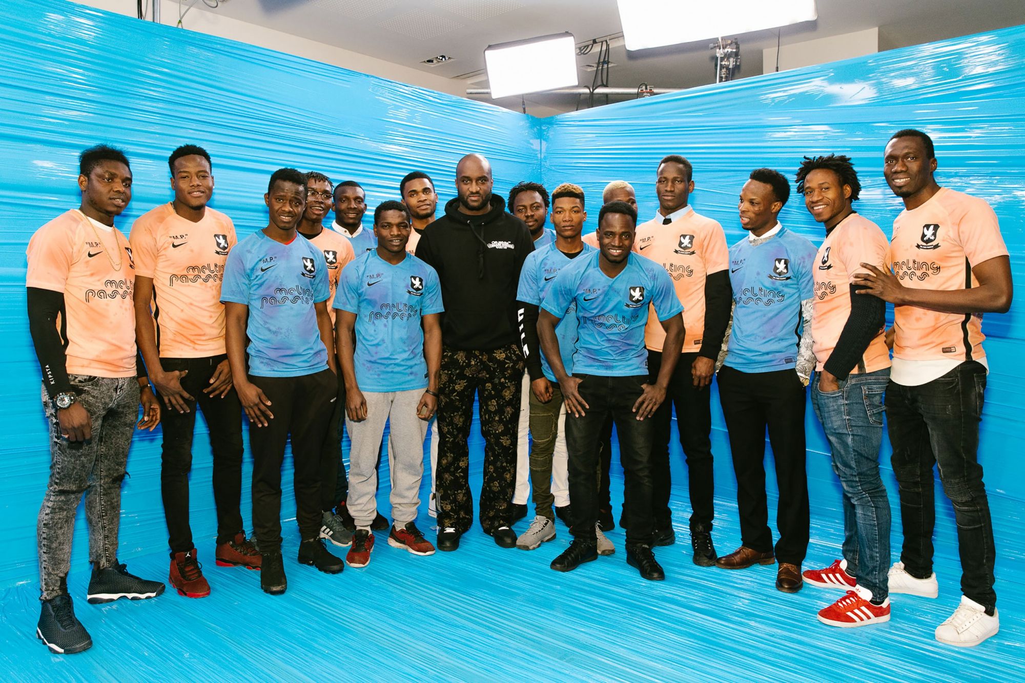 Un interesse per il gioco del calcio maturato attraverso i suoi genitori, traferitisi nei sobborghi di Chicago dal Ghana, insieme ad un profondo orgoglio verso le proprie origini tanto che lo stesso Abloh in un’intervista ad Highsnobiety del 2018, interpellato su quale maglia avrebbe mai voluto disegnare rispose senza esitazione proprio per la Nazionale ghanese. Un senso di responsabilità che Abloh ha sempre sentito e nel quale ha infuso la solita generosità, spendendosi in prima persona verso una squadra di Parigi, Melting Passes, composta da migranti senza documenti e quindi impossibilitati a tesserarsi in altre società dilettantistiche. Contattato durante una settimana della moda parigina da Anne Wintour, Abloh ha preso immediatamente a cuore il progetto e si è incontrato con i ragazzi della squadra per disegnare per loro un kit firmato Off-White con il quale scendere in campo sentendosi una vera e propria squadra. Un cerchio che si è concluso quando Abloh ha invitato sedici ragazzi di Melting Passes allo show di Off-White per l’Autunno 2018, tutti con le maglie blu e rosa da lui disegnate.
