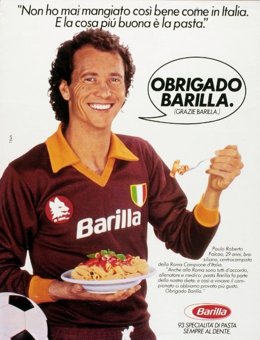 E così come il pastificio toscano con il club partenopeo, anche l’azienda parmigiana sfruttò molto a suo favore la collaborazione con i giallorossi accrescendo la sua popolarità grazie al club capitolino. Tante furono le campagne pubblicitarie in cui Barilla sfruttò il volto dei campioni della Roma e tra le più particolari non può non essere ricordata quella del 1983 con protagonista Paulo Roberto Falcao nell’intento di gustare una forchettata di maccheroni e la citazione: "Obrigado Barilla". Non ho mai mangiato così come ben come in Italia. E la cosa più buona è la pasta”.
