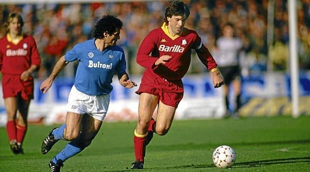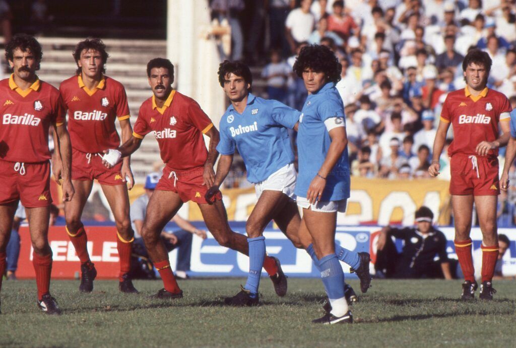 E gli anni ’80 furono anche quelli dei “derby della pasta”, con Buitoni sponsor del Napoli e Barilla della Roma. Da una parte i giallorossi di Bruno Conti, Ancelotti, Boniek e Pruzzo, dall’altra gli azzurri di Maradona, Giordano, Bagni e Careca. Stelle che hanno fatto la storia del calcio italiano e non solo, che si sono sfidate con indosso due marchi iconici del nostro Paese. E se Buitoni comparve sulle maglie del Napoli per soli tre anni, Barilla vestì la Roma per molto più tempo: dal 1981 al 1994, anni in cui la squadra della Capitale conquistò lo scudetto e ben tre Coppe Italia.