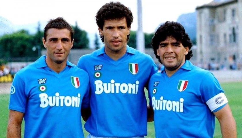 Buitoni diventa sponsor ufficiale del Napoli nel 1985, prendendo il posto di Cirio, consorzio italiano specializzato nelle conserve alimentari, e restando ben presente sulle maglie azzurre fino al 1988. Ma è proprio in questi tre anni che il marchio di pasta e la squadra partenopea scrivono la storia, guidati dalla magnificenza di Diego Armando Maradona. Nella stagione 1986-87, il Napoli riesce infatti a conquistare il suo primo scudetto vincendo un duello con la Juventus lungo tutto il campionato. In quell’anno, inoltre, gli azzurri alzarono al cielo anche la Coppa Italia centrando una leggendaria doppietta. E la maglia della stagione successiva, firmata “NR” e con tanto di sponsor del pastificio a risaltare sul petto, è una delle più ricercate dai collezionisti vista la presenza sia della toppa dello scudetto che quella della coppa nazionale. Questa divisa con colletto è stata inoltre inserita da ESPN all’ottavo posto nella top 10 delle maglie della Serie A più belle degli ultimi 35 anni. Nel 1988 Buitoni verrà poi sostituito da Mars come sponsor sulle maglie della squadra partenopea.