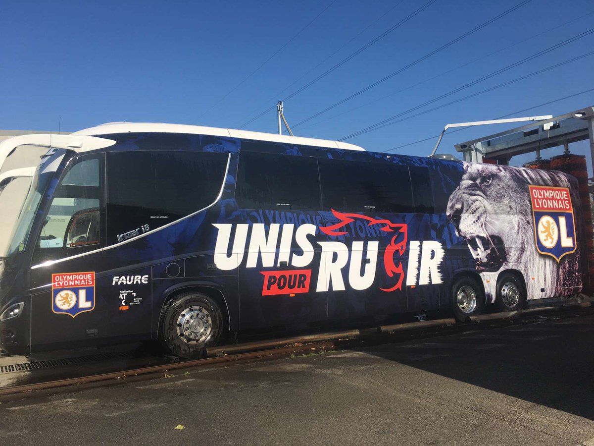 Il Lione è andato in giro per la Francia, e non solo, con un pullman stile animalier. Sulla fiancata presente infatti la gigantografia della testa di un Leone, un chiaro rimando al nome del club. Oltre al re della savana, anche il motto della squadra “Unis pour Rugir” (Uniti per rugire) con la lettera “g” trasformata nella bocca di un leone che ruggisce.