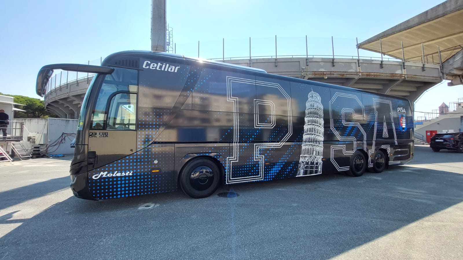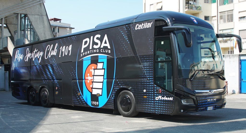 Anche in Serie B c’è chi vuole brandizzarsi ed entrare nel mondo dei pullman personalizzati. È il caso del Pisa che ha recentemente presentato il nuovo bus ufficiale della squadra in collaborazione con Molesti Viaggi. Colori sociali nerazzurri e un particolare legame con la città. La scritta Pisa che riempie l’intera facciata porta al suo interno, infatti, un chiaro rimando al monumento pisano più iconico: la Torre di Pisa, che prende il posto della letta “i”.