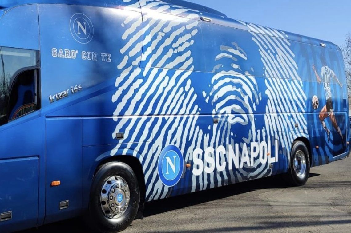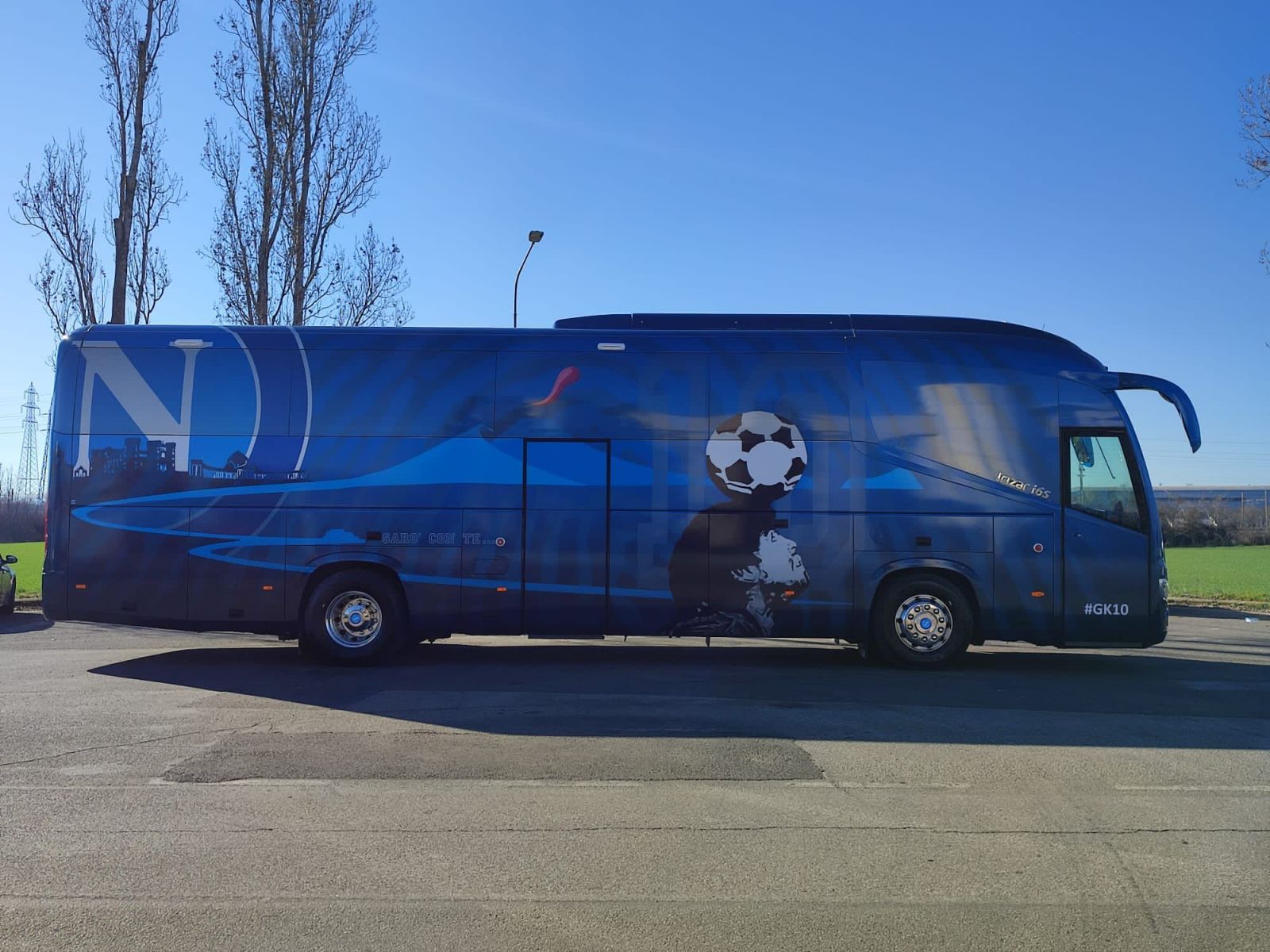 Quest’anno il Napoli ha deciso di rifare il look del proprio pullman di rappresentanza e per farlo ha puntato tutto sulla leggenda del club: Diego Armando Maradona. Sulla fiancata sinistra il volto del Pibe de Oro, disegnato da Giuseppe Klain, così come rappresentato sulle maglie celebrative della passata stagione, con al suo fianco l’argentino in azione con la divisa della Seleccion. Sulla parte destra dell’autobus, invece, ancora D10S che palleggia di testa con il golfo di Napoli e il Vesuvio sullo sfondo. Presente anche la scritta “Sarò con te”, citazione di uno dei cori più caro ai tifosi partenopei.