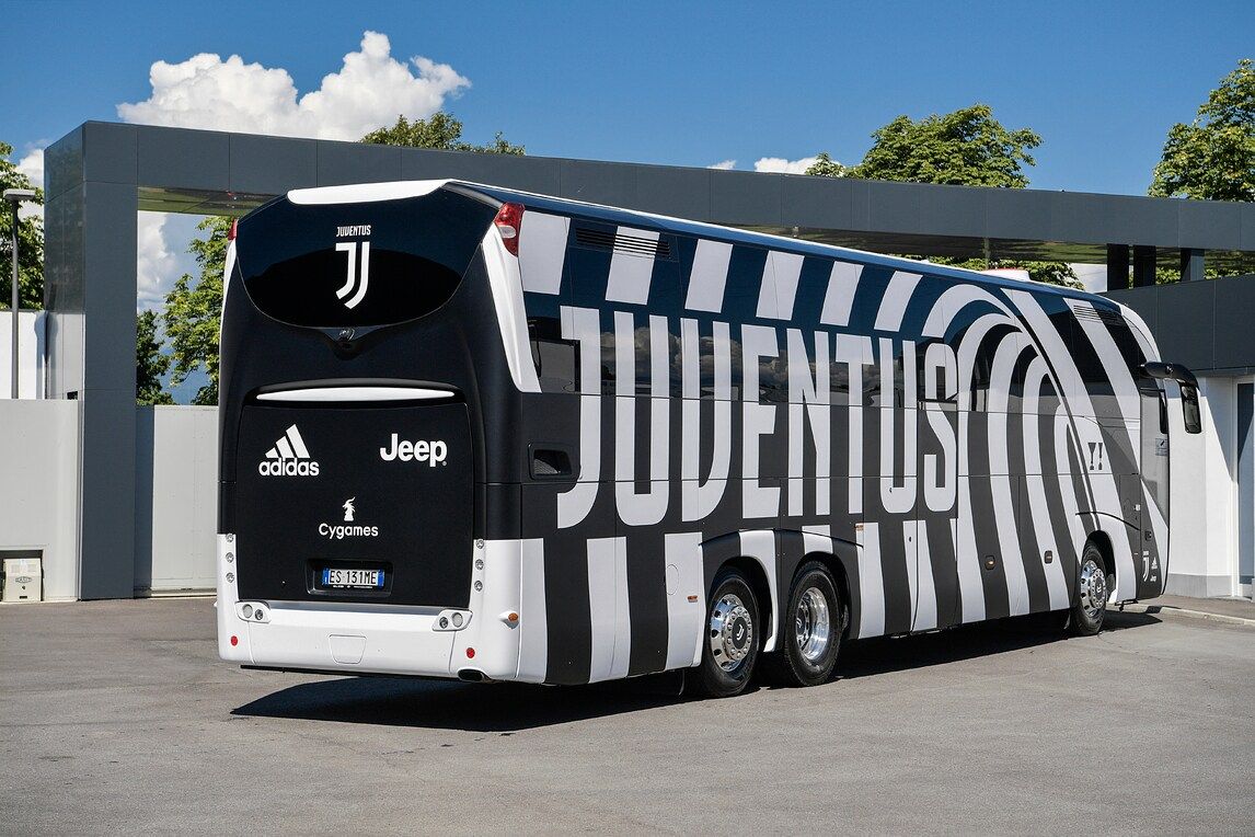 Dalla stagione 2020, invece, la Juventus è passata da un pullman “stravagante” a uno più semplice. Questa volta a scegliere il look del mezzo trasporto sono stati i tifosi bianconeri attraverso una votazione sulla piattaforma Socios. Total black, con il nome del club sulla fiancata destra e la scritta “Live Ahead”, vivere in avanti, su quella sinistra che sta a significare la mentalità e il DNA della società italiana dentro e fuori dal campo.