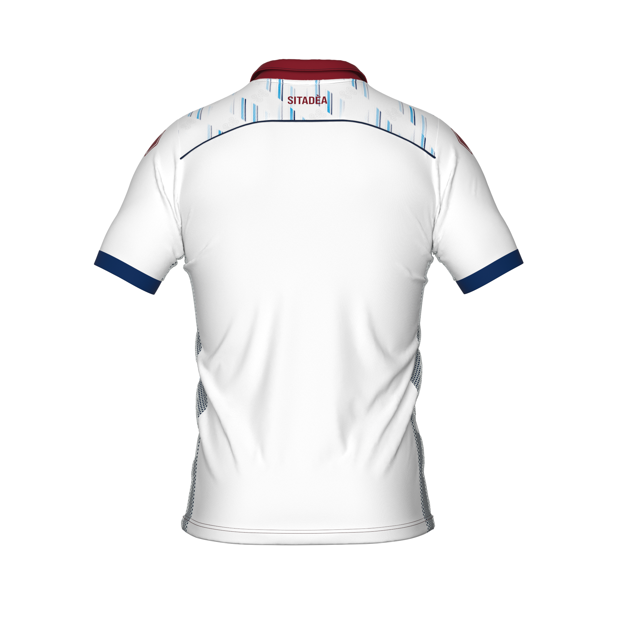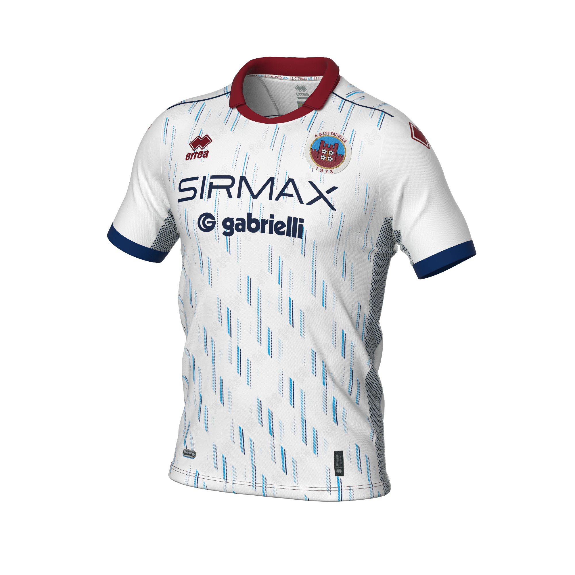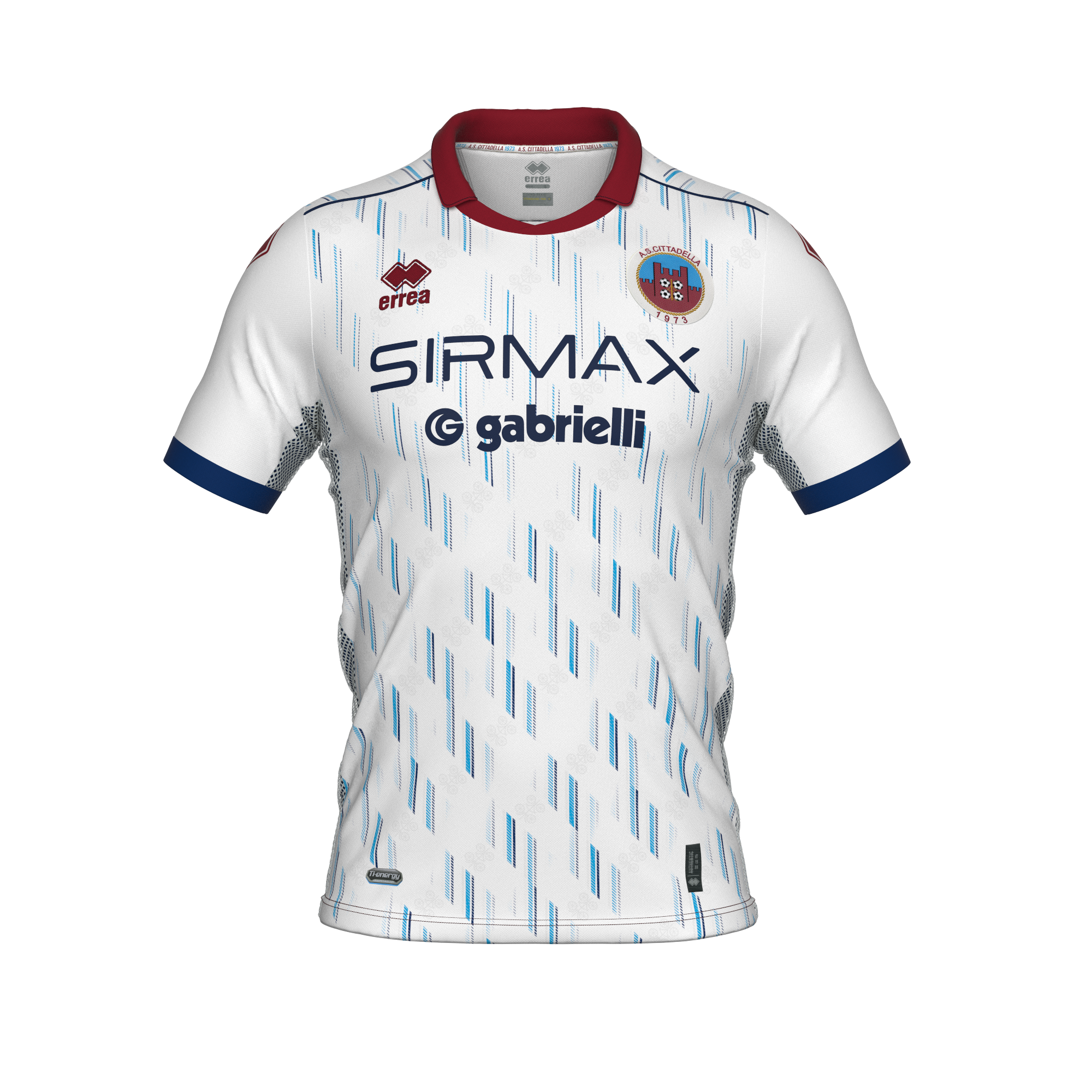 Bianca con un originale design geometrico composto di graffi azzurri accompagnati da dettagli granata come il collo a polo, e il blu del bordo manica, questo è quanto proposto dal brand italiano Erreà per il Cittadella. Una delle squadre che ha senza dubbio sorpreso di più sotto il punto di vista e che adesso spera di farlo anche sotto quello sportivo, conquistando una promozione che ha sempre e solo sfiorato nelle passate stagioni.