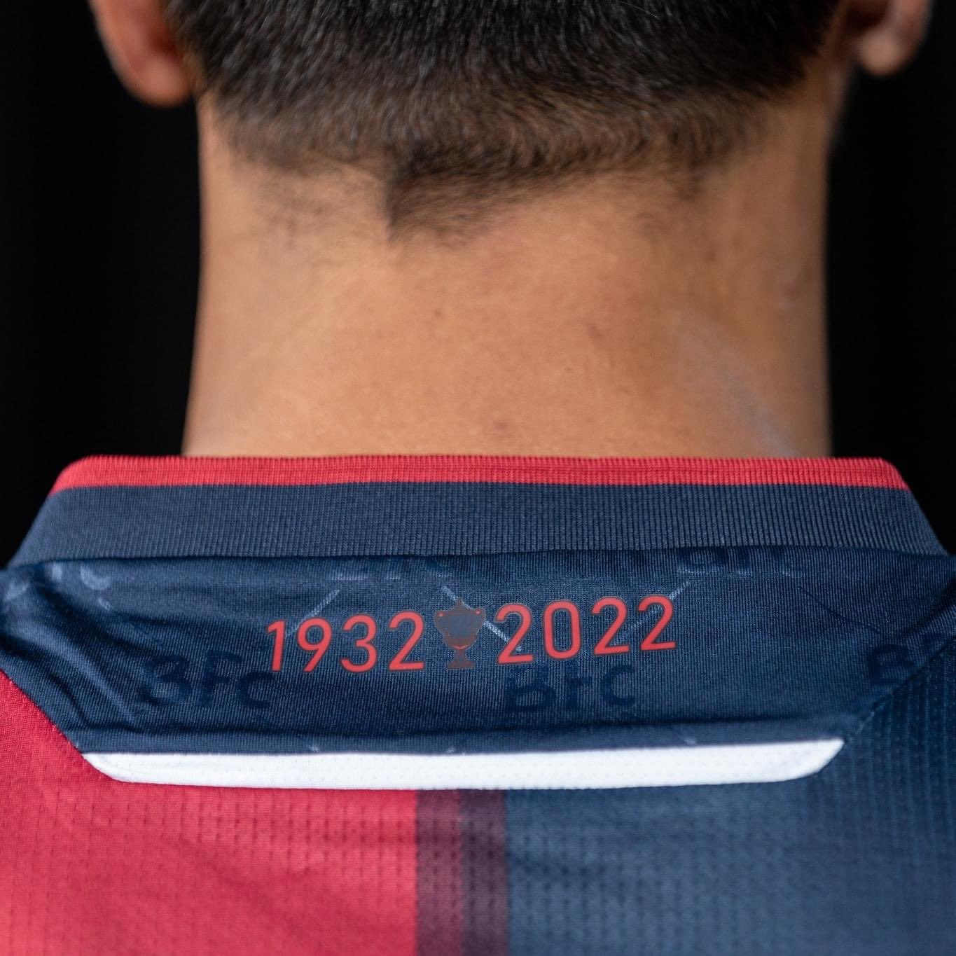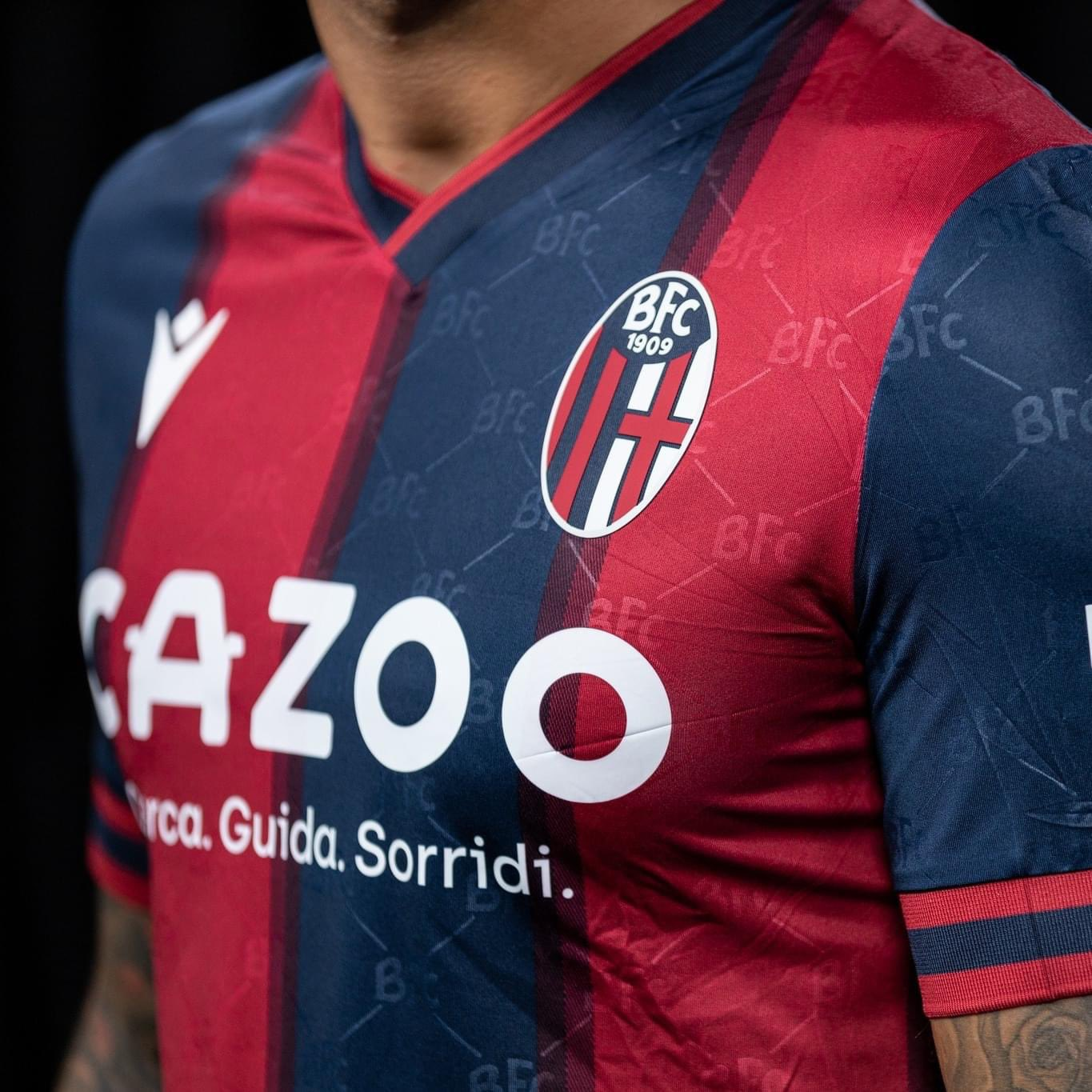 Come detto, il tocco che definisce la maglia è dato dalla grafica all-over, sia sulla parte anteriore e sulle maniche, che richiama un monogram con l'uso dell’acronimo BFC, ripreso dal logo del club, stampato in rilievo. Sul petto, in stampa siliconata, è presente a destra logo Macron e a sinistra il logo del Bologna Fc 1909. Un trend molto forte in Serie A, presente anche sulle maglie di Roma e Napoli.