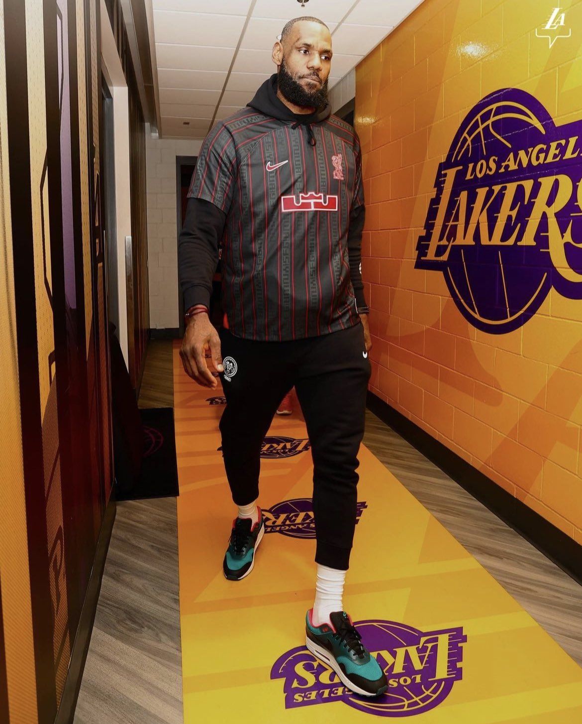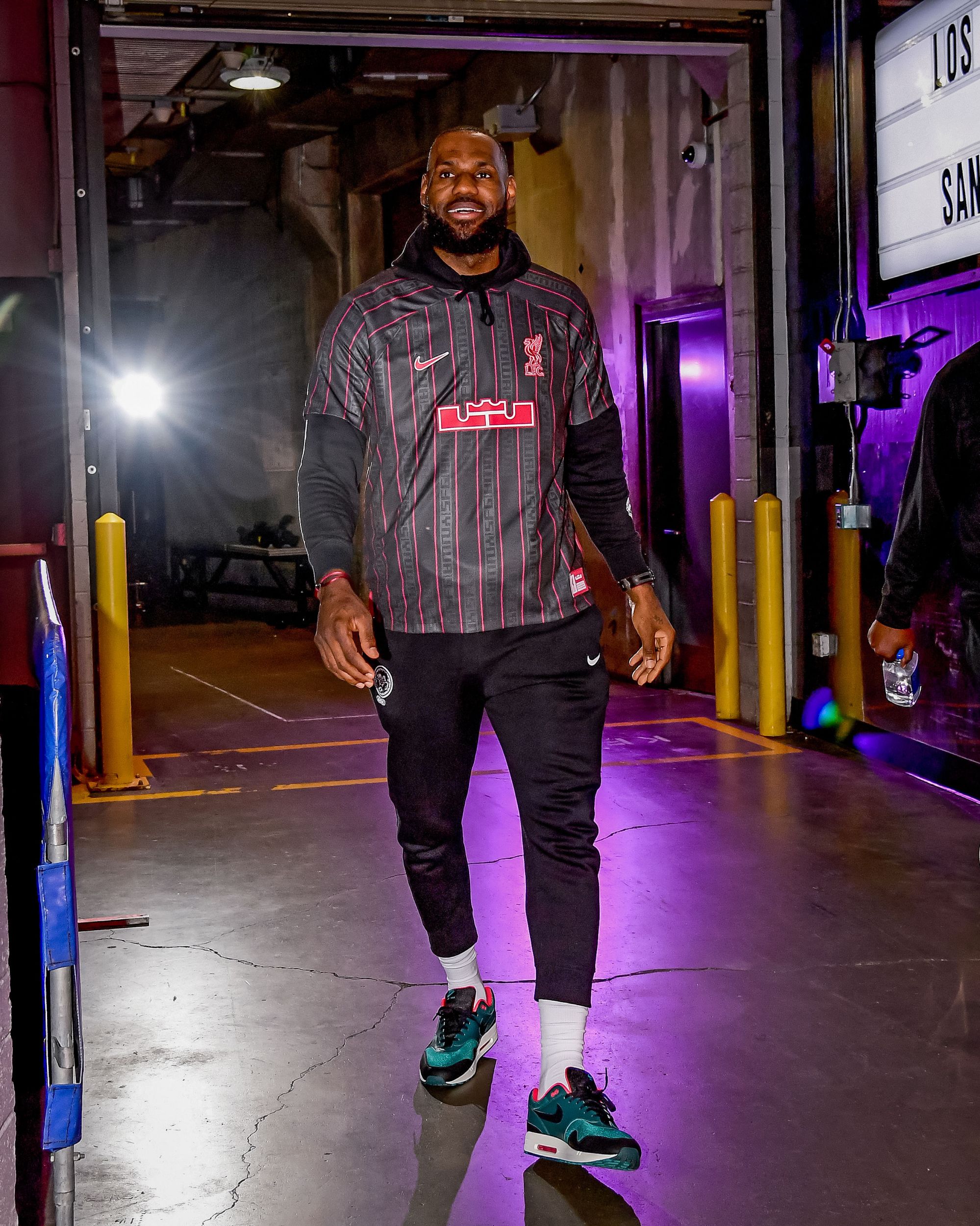 Dopo le immagini delle nuove Nike LeBron 20 con i colori sociali del Liverpool, ieri sera The Chosen One si è presentato nel tunnel della Crypto.come Arena con indosso la maglia dei Reds realizzata da Nike proprio per il fuoriclasse gialloviola. La maglia nera con sottili righe e dettagli in rosso, sul petto il logo di James con la corona, mentre in basso a destra è stata apposto il tag con su scritto "engineered to the exact specifications of Liverpool e LeBron James". Ai piedi il Re indossava un paio di Air Max 1 che faranno parte della collezione Liverpool x LeBron James, di prossima uscita.