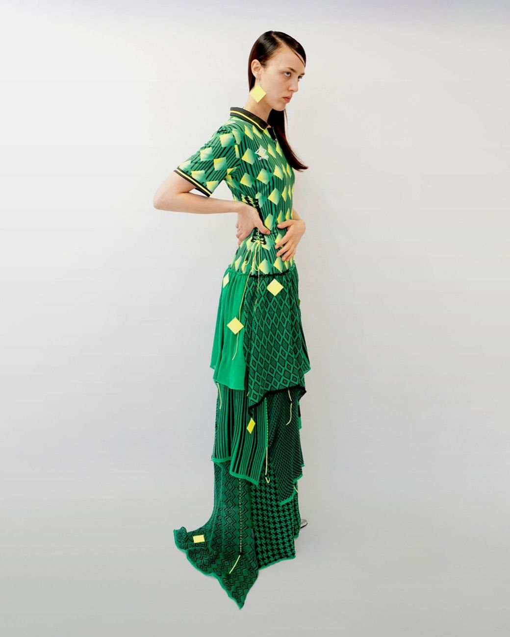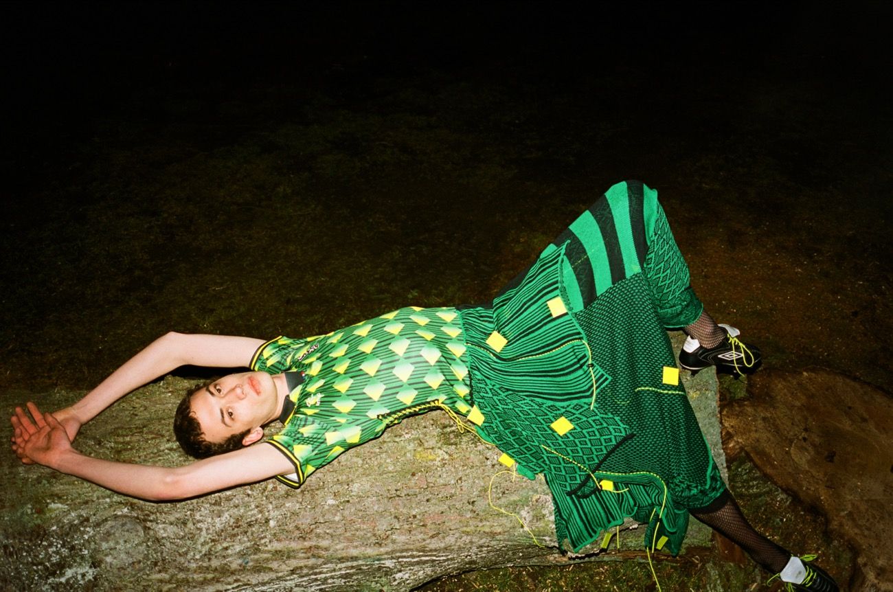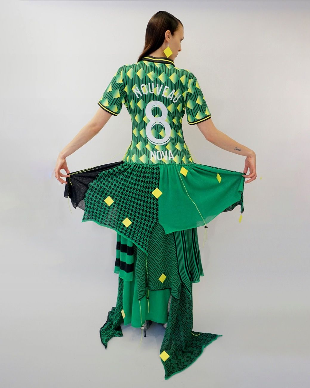 "Il tema del mio progetto è il contrasto: il contrasto tra la maglia da calcio, più maschile, e la forma stereotipata e femminile dell'abito. I tessuti sintetici e resistenti della maglia contro i delicati pannelli in cotone, il top bidimensionale contro lo slip tridimensionale e così via" ha spiegato l'artista Nova Nørgaard.