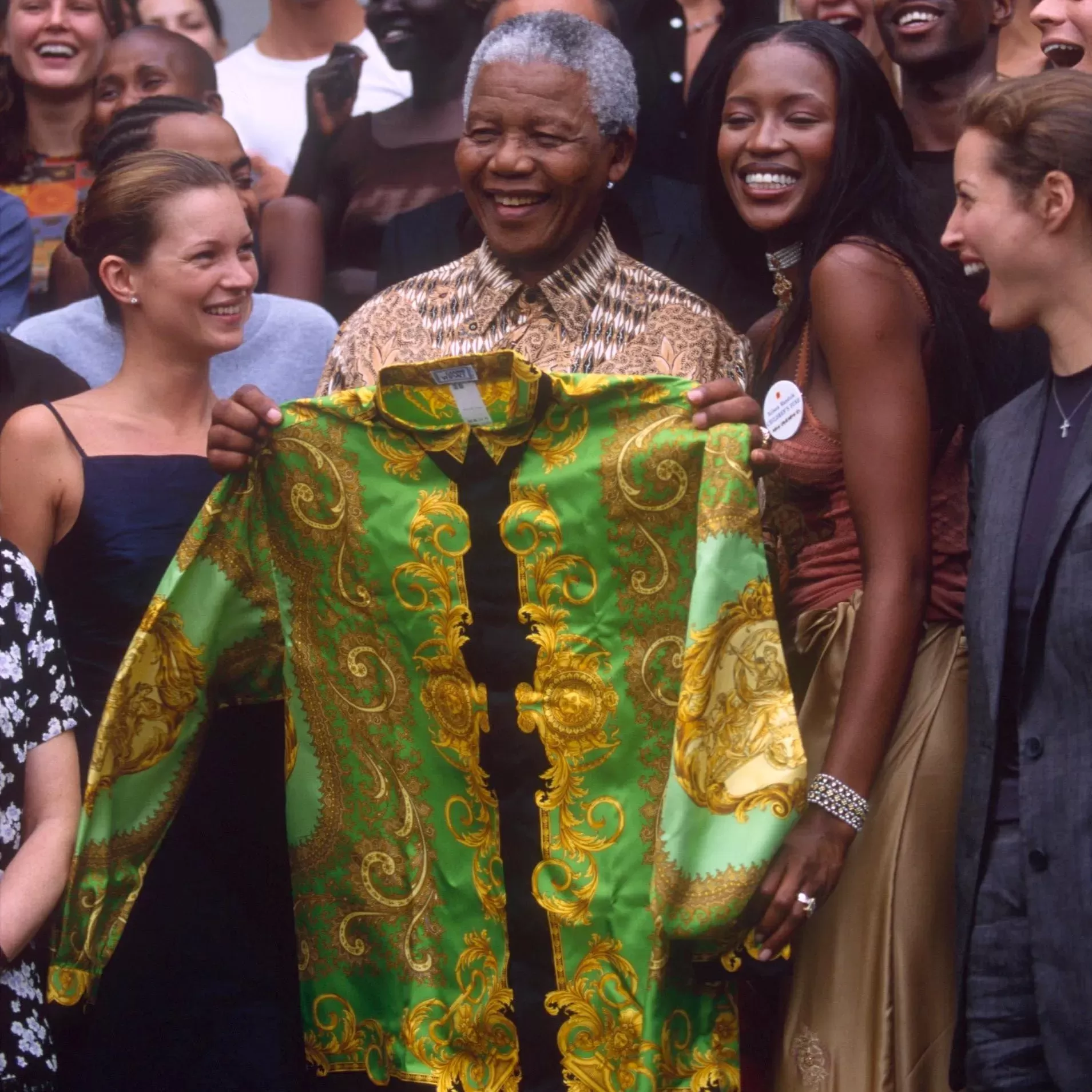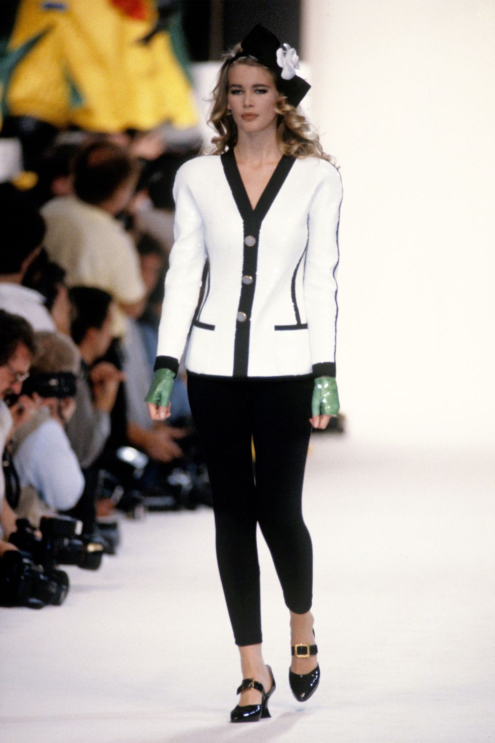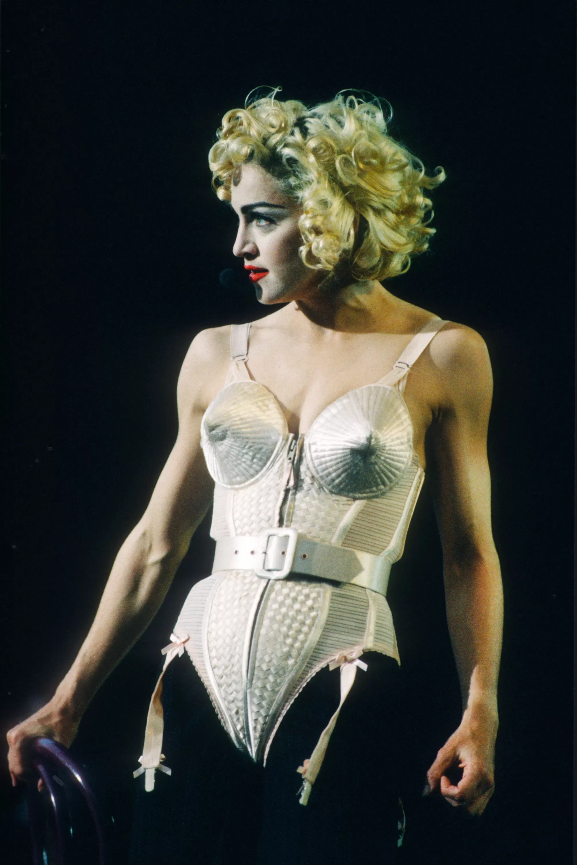 Anche il mondo dell’alta moda viveva un momento di transizione. Karl Lagerfield per Coco Chanel per la primavera-estate 1990 realizza una collezione più leggera in cui alterna completi eleganti dai colori accesi a tailleur neri con dettagli in oro e in bianco, in uno dei suoi primi azzardi con materiali non tradizionali. La rivoluzione di Versace si completerà nel 1991, quando lo stilista italiano invaderà le sue collezioni di colori appariscenti e gioielli sgargianti raggiungendo il suo apice nel 1994 quando Nelson Mandela venne immortalato tenendo fra le mani una camicia verde con inserti in oro e ocra firmata da Versace mentre è attorniato dalle top model più famose dell’epoca. Il tentativo di Versace di incrociare gusti più moderni era cominciato però qualche mese prima quando nel 1989 fondò Versus, la seconda linea della casa di moda che si caratterizzò immediatamente per un approccio che diede vita allo stile rock-chic che caratterizzò il marchio da quel momento in poi. Ma nella moda il 1990 è l’anno di è Jean Paul Gaultier: lo stilista francese disegna infatti uno dei pochi pezzi in grado di entrare immediatamente nell’immaginario collettivo, il reggiseno a cono creato su richiesta personale di Madonna per “Blonde Ambition”, il tour mondiale che accompagna l’uscita del disco “Like a Prayer” e che è stato definito il miglior live nella storia della musica pop.