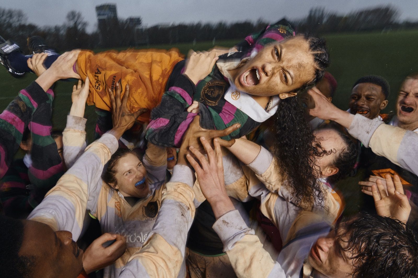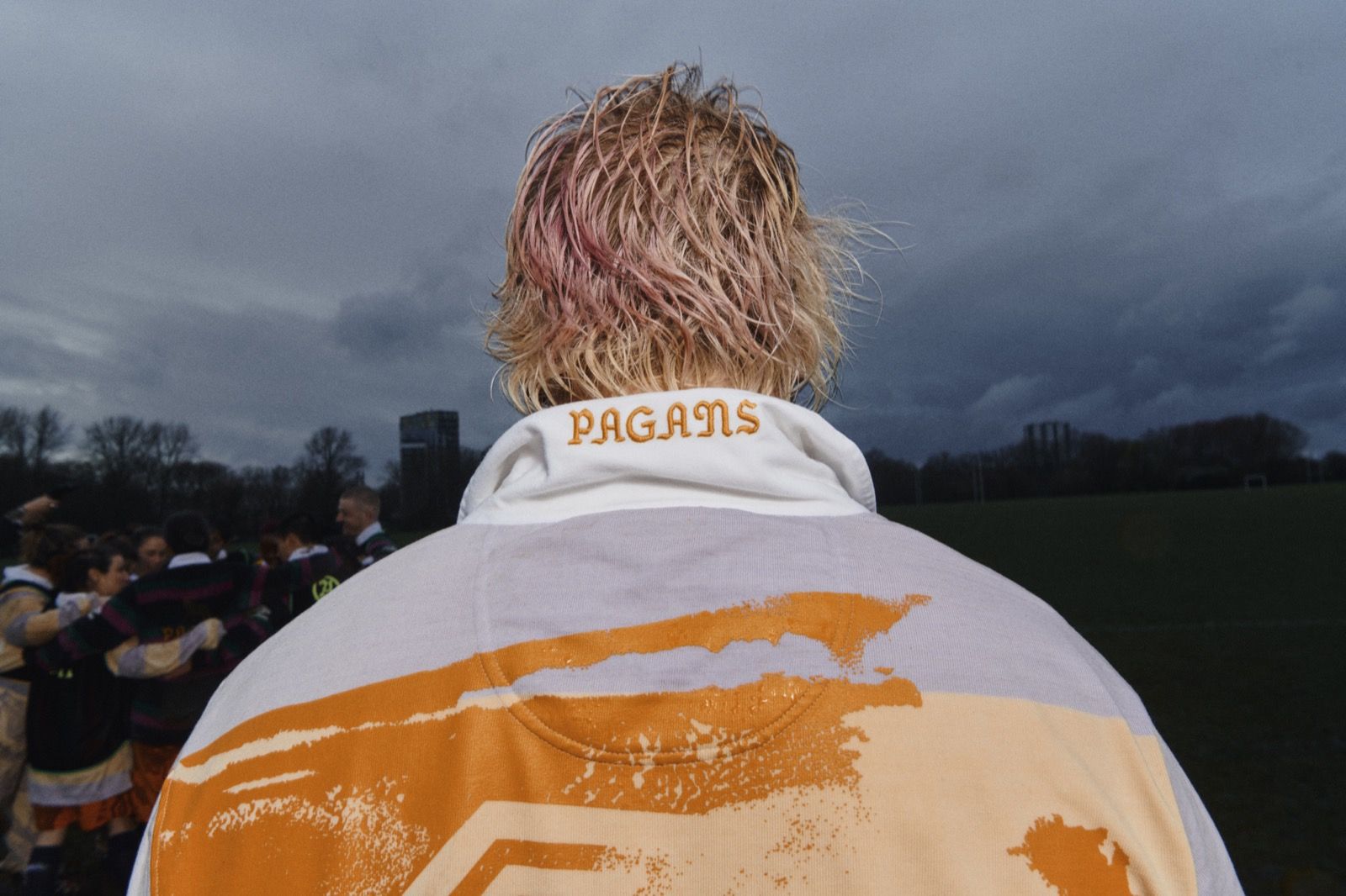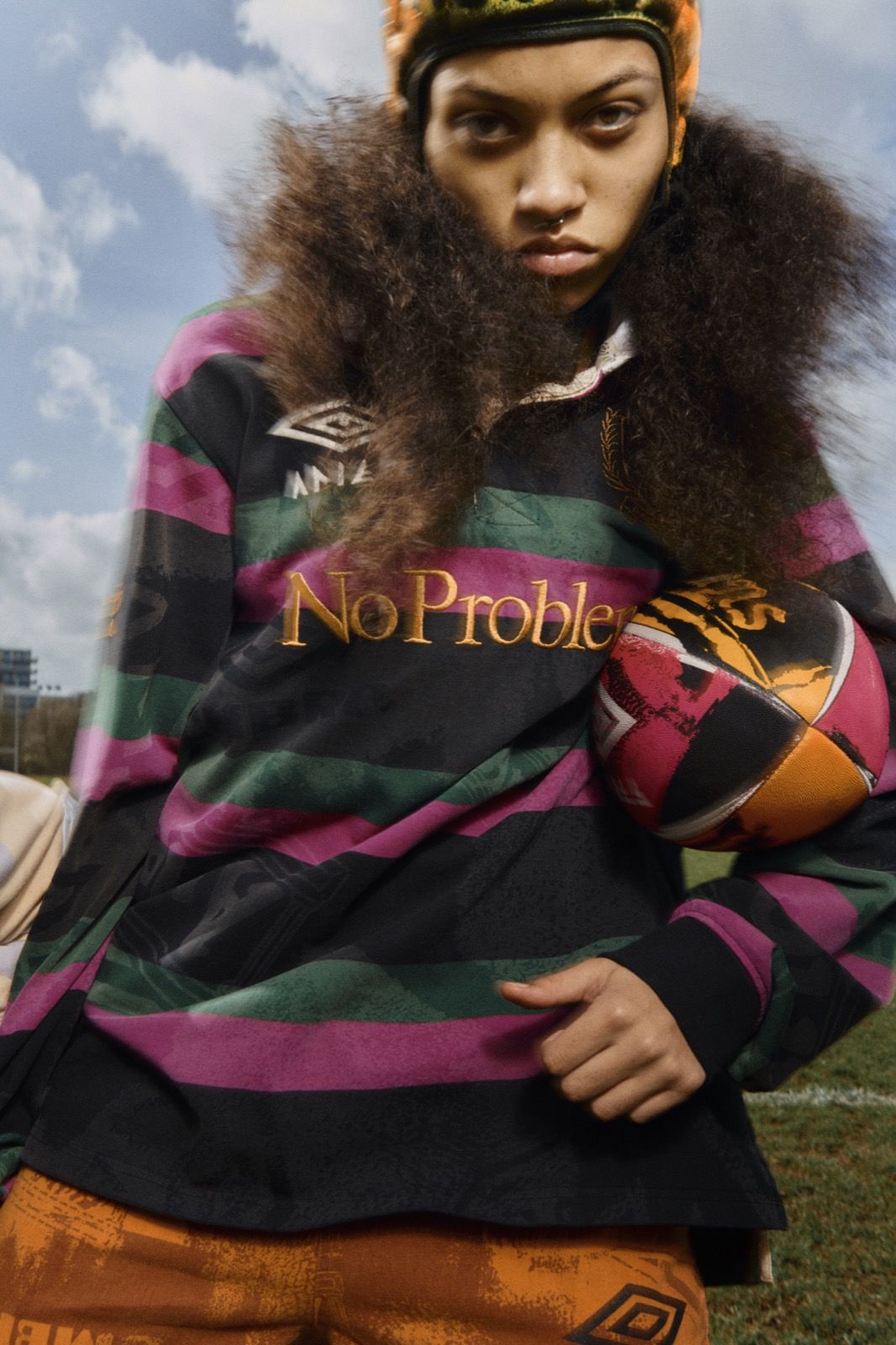 La capsule collection comprende 2 camicie da rugby classiche, track pant e pantaloncini in cotone drill e calzini da rugby neon e deep navy. Classiche strisce a blocchi con un trattamento patchy over-dye e sbiadito al sole e una stampa ripetuta di Aries Temple sottilmente sbiadita. Stemma Umbro da rugby con esecuzione vintage, sfumature mistiche e tendenze cult. La campagna è stata scattata dalla regista e leggendaria fotografa Elaine Constantine, conosciuta per i suoi ritratti della cultura giovanile britannica e qui all'opera tra le squadre di rugby locali dell'est di Londra dell'Hackney Rugby Club.