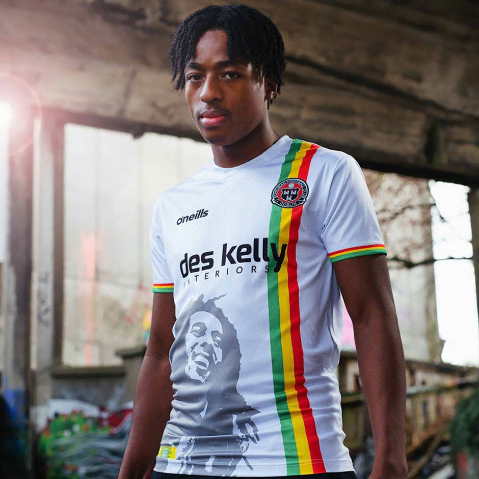 Ma non sono certo queste le prime volte che il mondo del calcio ha celebrato uno dei suoi più riconoscibili tifosi. Uno degli esempi più immediati riguarda la terza maglia dell'Ajax disegnata da adidas per la stagione 2021/22 con base nera e maniche e colletto in rosso, verde e giallo, i colori del rastafarianesimo. Inoltre questa maglia è passata alla storia per i tre uccelli ricamati in rosso nel back, i Three Little Bird che divenne l'inno non ufficiale del club olandese cantato anche Ky-Mani Marley, figlio del grande Bob. La maglia però non rientrava nei regolamenti UEFA, a causa dei riferimenti al cantante diversi rispetto al logo del club e degli sponsor. Sorte simile a quella toccata alla maglia realizzata dal club irlandese Bohemian FC, che già nel 2019 sognava di creare una maglia che ricordasse il concerto di Marley nello stadio del club, il Dalymount Park, il 6 Luglio 1980. Solo che al tempo la squadra che milita nella Prima Divisione della Lega Irlandese non aveva i diritti per l'immagine scelta del volto del cantante stampata al centro della maglia. Ma il club non si è perso d'animo ed ha realizzato la maglia tre anni dopo, con design praticamente identico.