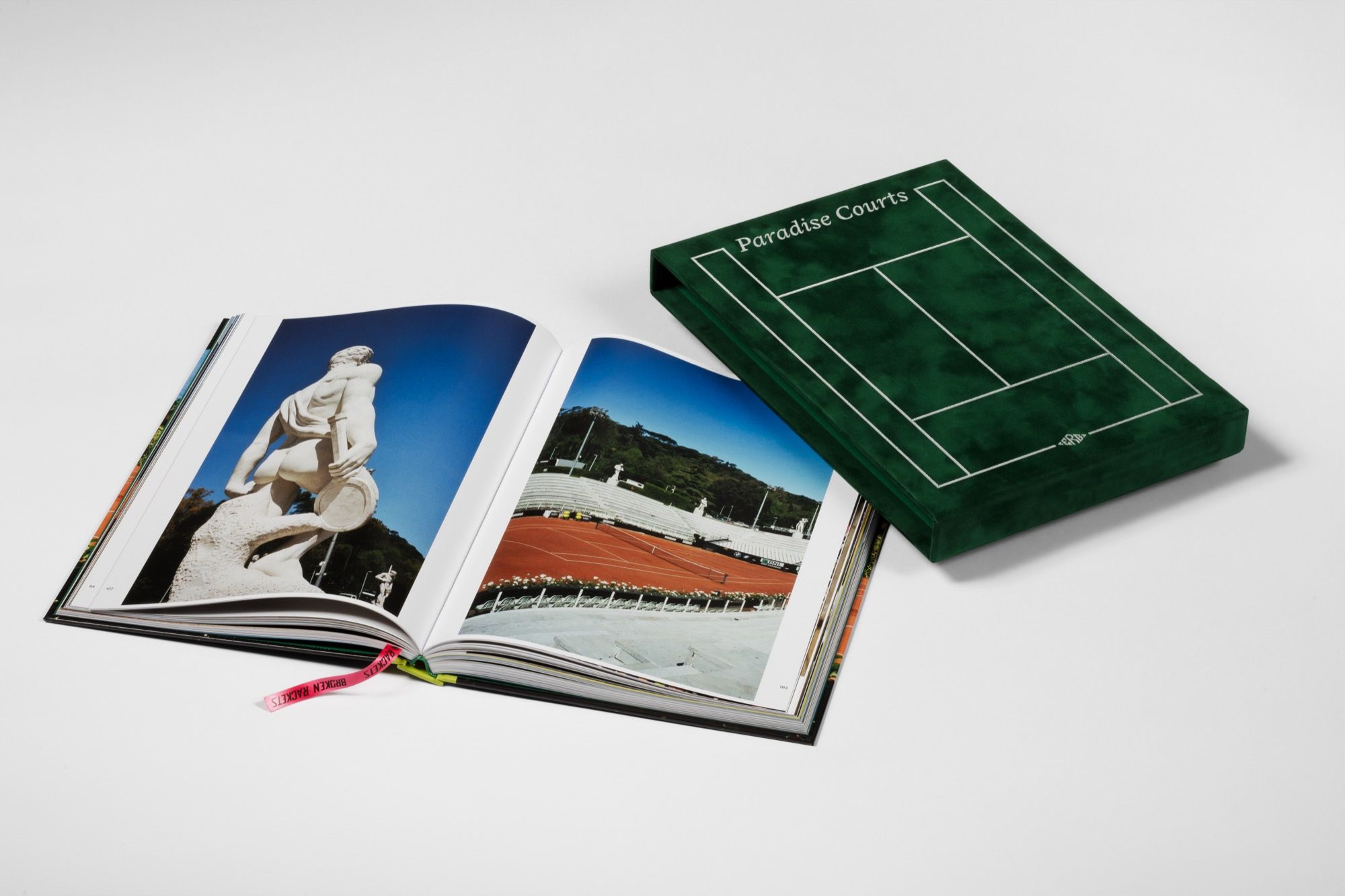 Paradise Courts raccoglie oltre 200 immagini originali di d’Angelo, accuratamente selezionate e disposte in un volume di grande formato, rilegato in copertina rigida con dorso giallo palla da tennis e raffinata custodia in velluto verde. Le immagini accompagnano il lettore alla scoperta dei campi più esclusivi del mondo, dagli hotel a cinque stelle alle leggendarie spiagge di Rio de Janeiro, passando per il mare cristallino della Sardegna. Il suo sguardo si sofferma anche sui gesti degli spettatori, sui loro impeccabili outfit e sul lifestyle degli amanti della terra rossa.