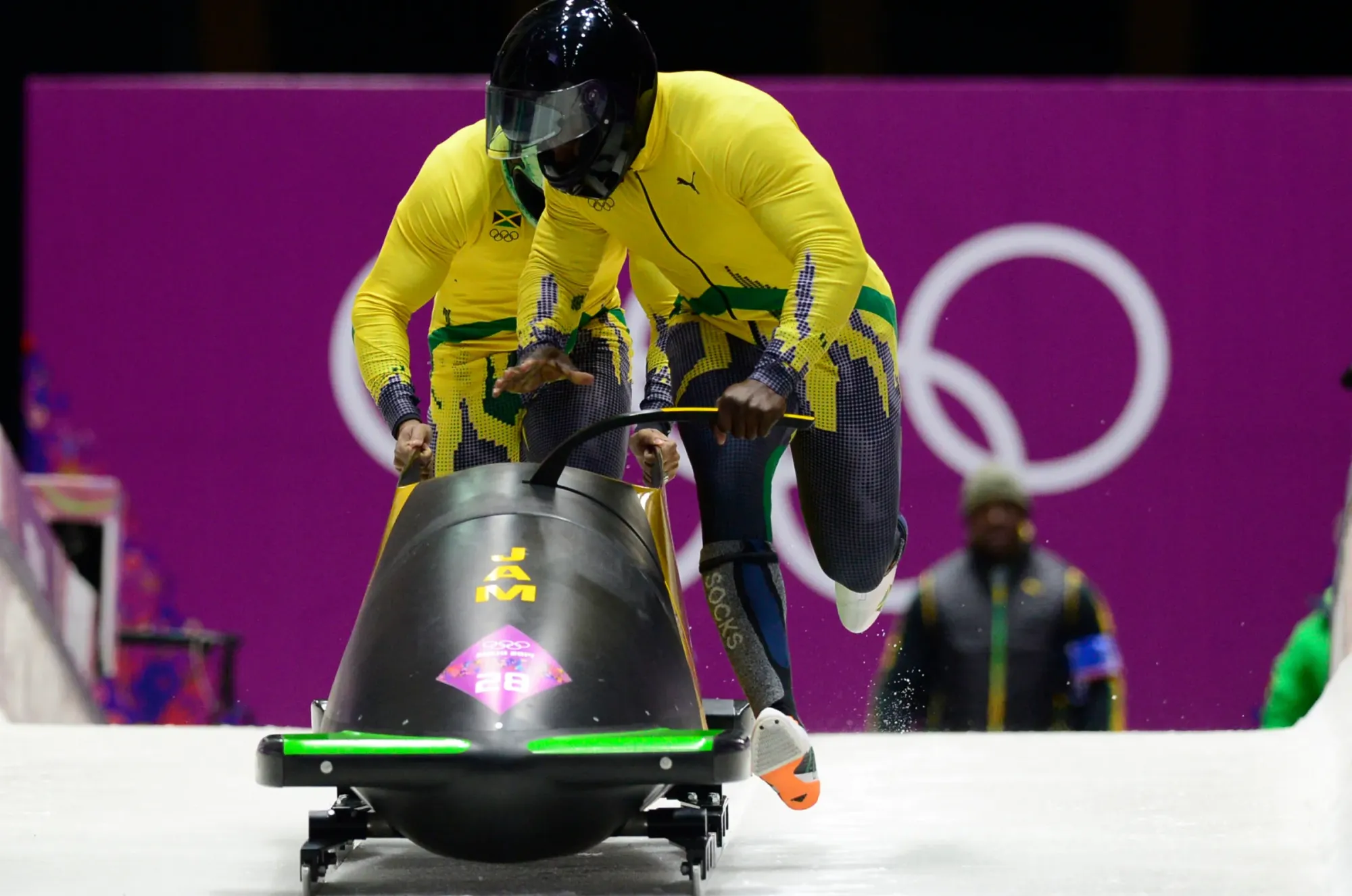 È l’edizione del 2002 a Salt Lake City a sconvolgere i parametri estetici in quanto viene realizzata una tuta in tinta unita gialla spezzata solamente da elementi bianchi, eliminando di conseguenza qualsiasi inserto nero. La nazionale giamaicana di bob saltò le due edizione successive a Torino e Vancouver per tornare a Sochi, in Russia, nel 2014: per l’occasione PUMA decise di riprendere il discorso estetico dallo stesso punto in cui era stato abbandonato, disegnando dalle tute gialle nella parte superiore con piccoli inserti pixelati neri all’altezza dei polsi e del torso, che andavano poi a combinarsi con il pezzo inferiore della tuta.