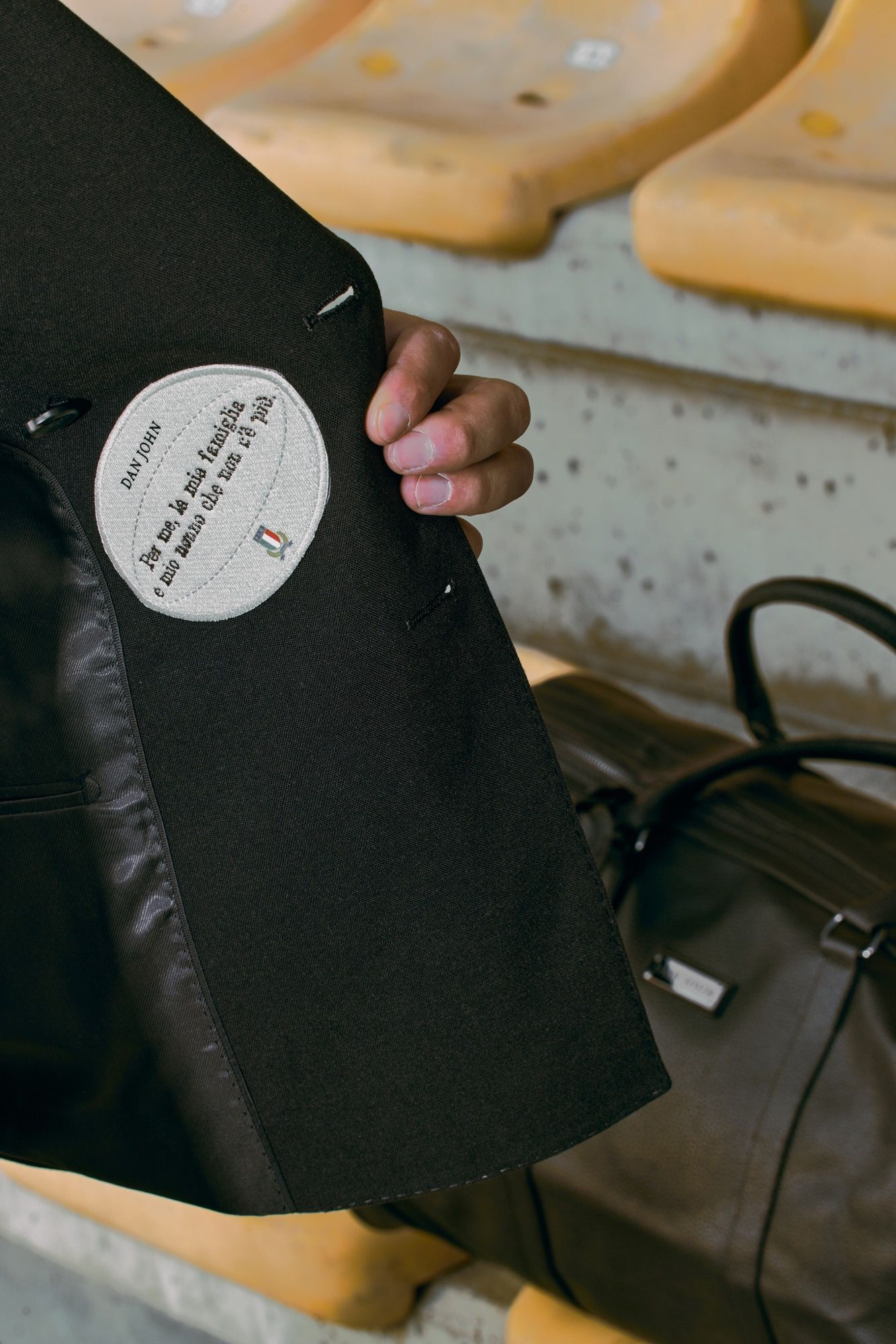 Le uniformi degli atleti Azzurri saranno molto classiche, con un completo moro, composto da un blazer doppiopetto in tela con tasche a toppa e pantalone con pinces, abbinato a una t-shirt bianca dove spicca il branding di Dan John. La particolarità si trova all’interno della giacca, dove una patch tonda e una cucitura seguono la silhouette di una palla da rugby: una patch tailor-made con una frase che racchiude la risposta di ciascun atleta alla domanda «Per chi giochi davvero?». All'abito, Dan John ha scelto di abbinare anche una borsa da viaggio, l’accessorio ideale per completare un perfetto look da travelwear.