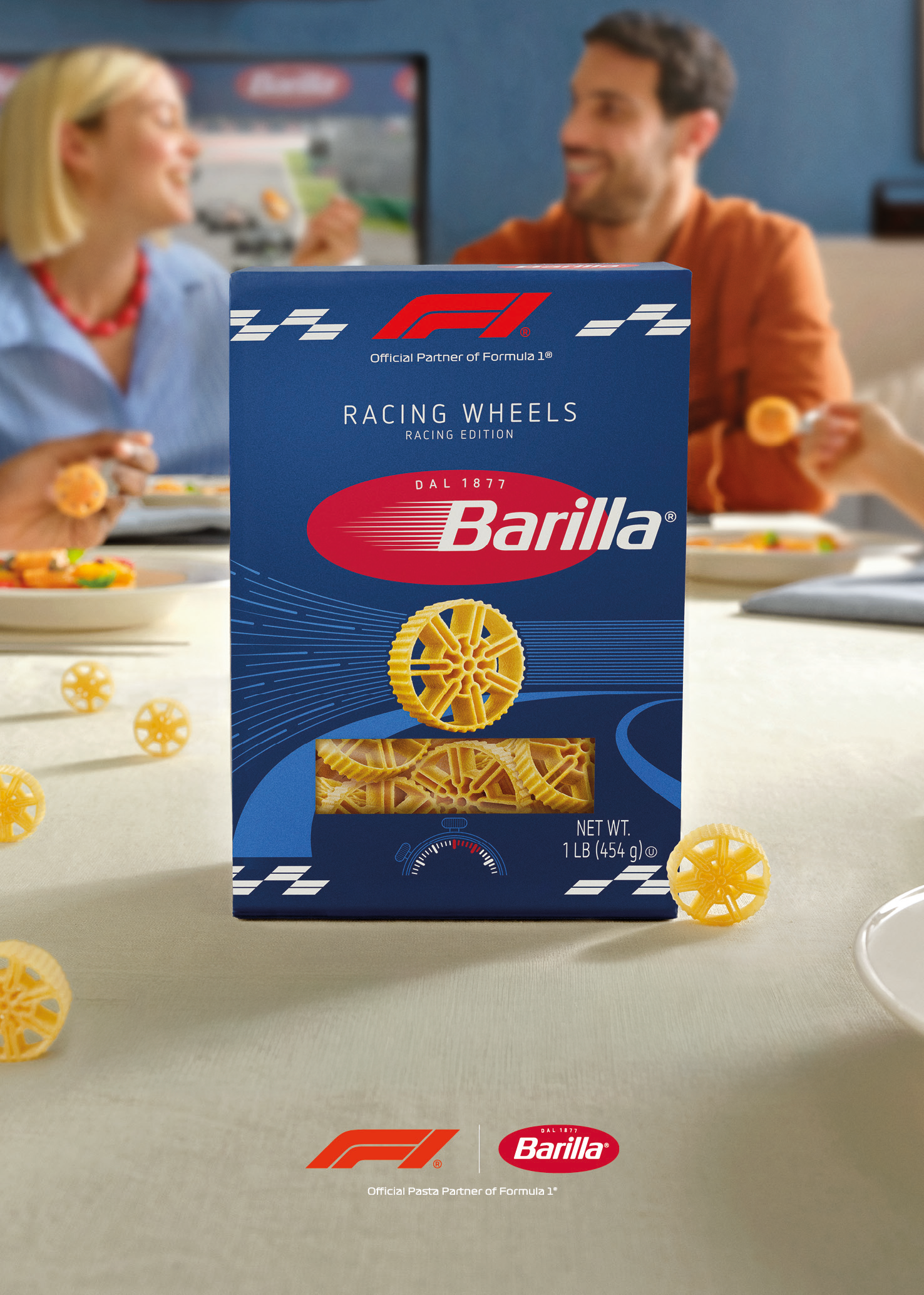 Barilla è uno degli Official Partner di Formula 1 e per rafforzare ulteriormente questa unione, l'azienda italiana ha presentato un nuovo prodotto: Racing Wheels. Si tratta di un formato di pasta dedicato alla Formula 1 riprendendo il design delle ruote per cui con una forma circolare con il bordo esterno scanalato e al suo interno un design che riprende i cerchioni.