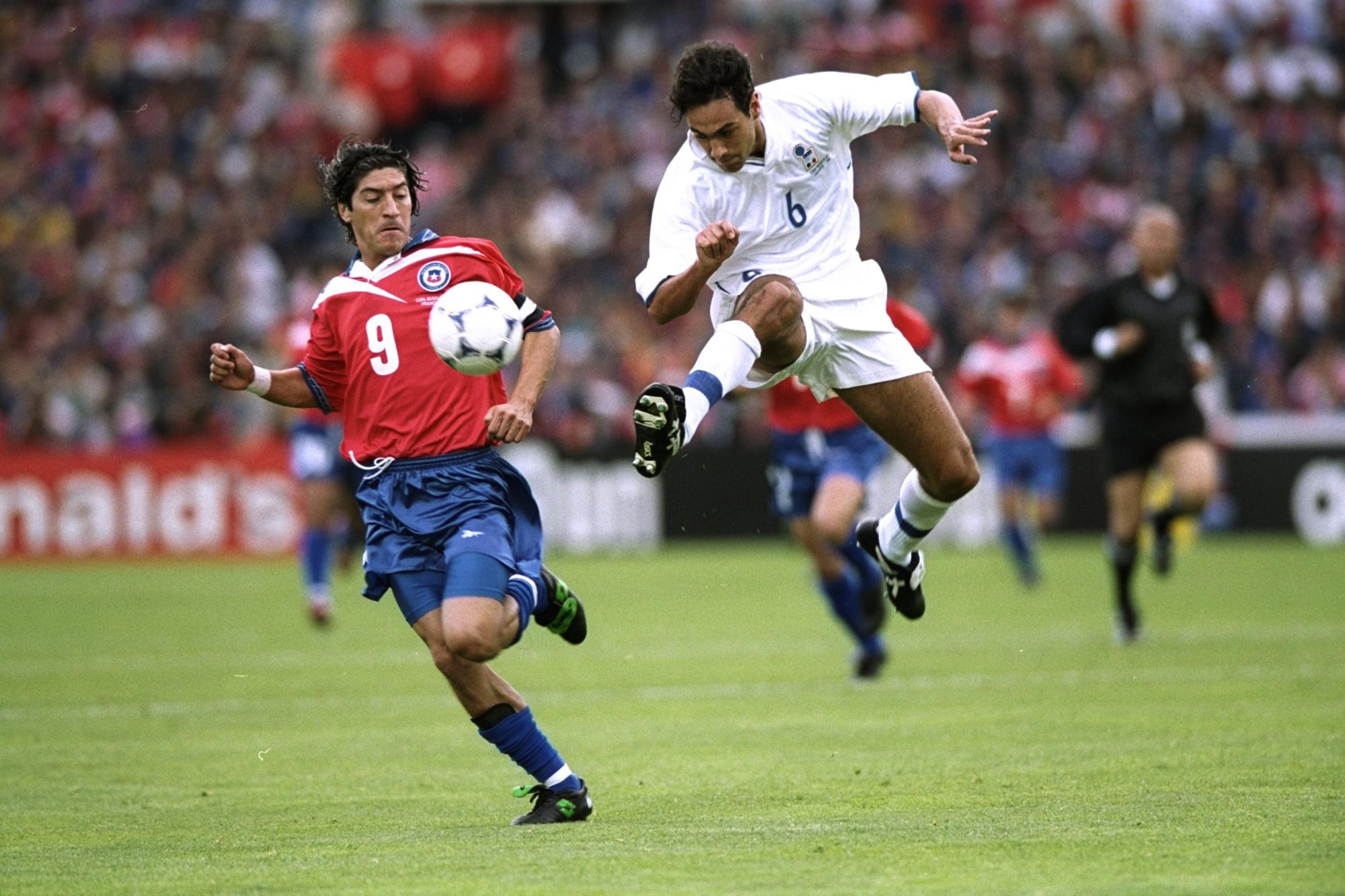 L’estetica di Reebok ai Mondiali riparte da due maglie per cui l'appellativo di culto non risulta esagerato. Il primo riferimento è alle jerseys sviluppate per il Cile in occasione di Francia '98. In quell’edizione Reebok era sponsor tecnico anche di Paraguay e Colombia ma sono le maglie de La Roja a catturare l’attenzione. Questo perché il Vector diventa parte integrante del design, disegnato in bianco su fondo rosso sulla Home e in rosso su fondo bianco sull’Away lungo tutta la parte superiore. Una fantasia che Reebok aveva già sdoganato qualche anno prima, probabilmente l’unico caso in cui il logo di un brand diventa parte integrante del progetto creativo.