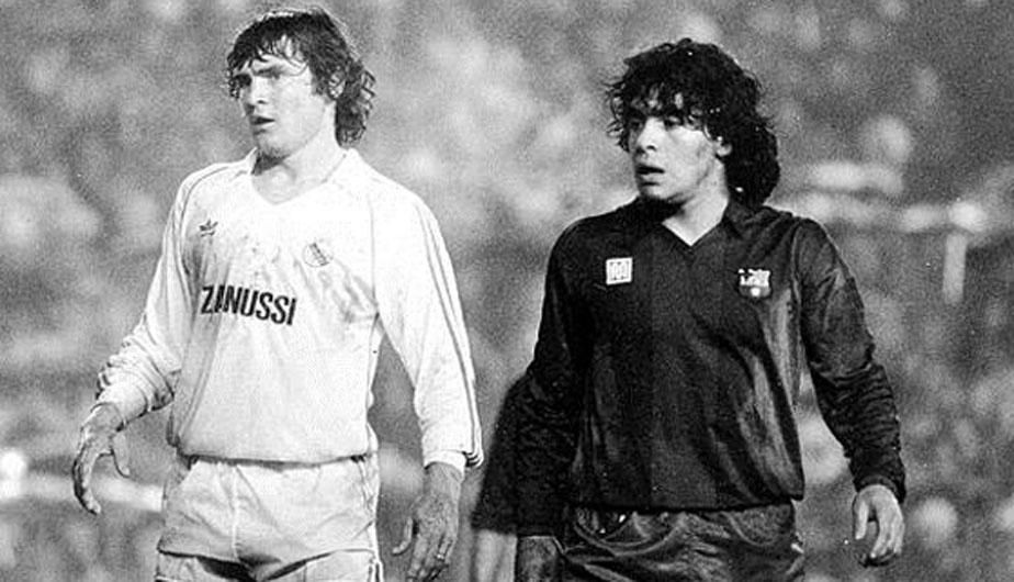 Questa è un’altra meravigliosa istantanea del Clasico: Camacho, storico difensore madrileno a cavallo tra ’70 e ’80, accanto a Diego Maradona ai tempi giocatore del Barcellona, la cui divisa come si ben nota, era immacolata.