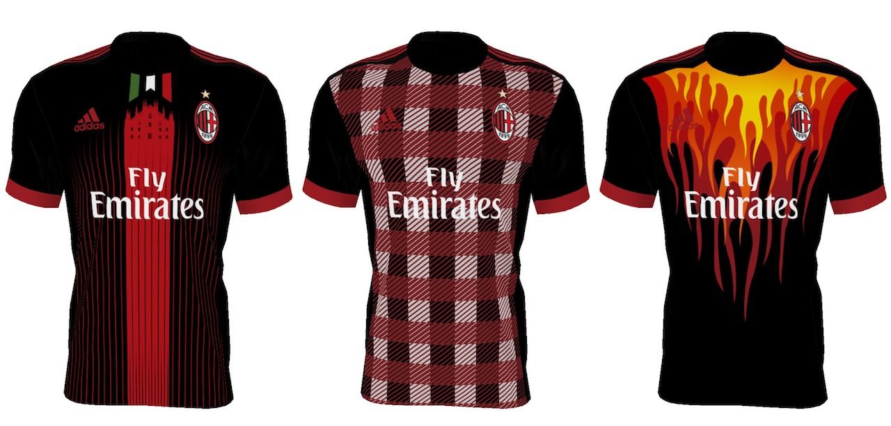 Base nera con inserti rossi per la squadra meneghina, che di per sé non rappresenta una grande novità. Grazie all’estro dei designer, però, sono venute fuori alcune maglie veramente interessanti. La prima ha una trama di strisce rosse verticali molto sottili che si ispessisce al centro, impreziosita dalla silhouette del Duomo di Milano all’altezza del cuore. La seconda ha un disegno quasi scozzese con la sovrapposizione di bianco, nero e rosso. Particolare, ma che potrebbe avere successo. Tra i 100 ci siamo anche noi di nss factory, con un versione flame.